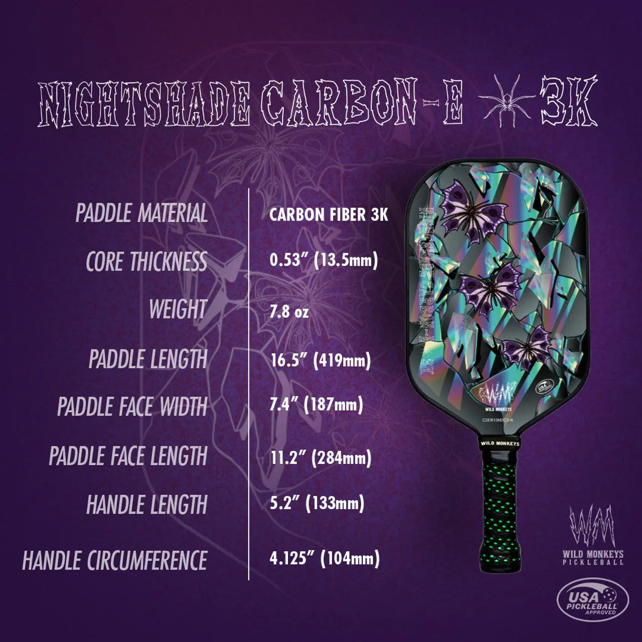 Beautiful and dangerous like the toxic plant for which itâs named and designed. Nightshade Carbonâs wide body and elongated shapes are both 8.4 oz with 13.5mm core and 5 in handle. This carbon fiber 3k paddle lives on the lighter side of midweight (before grip customizations), increasing potential swing speed and reducing fatigue without eliminating opportunity for two handed backhand. And the 13.5 mm core makes for plenty of put-away power when the time is right.