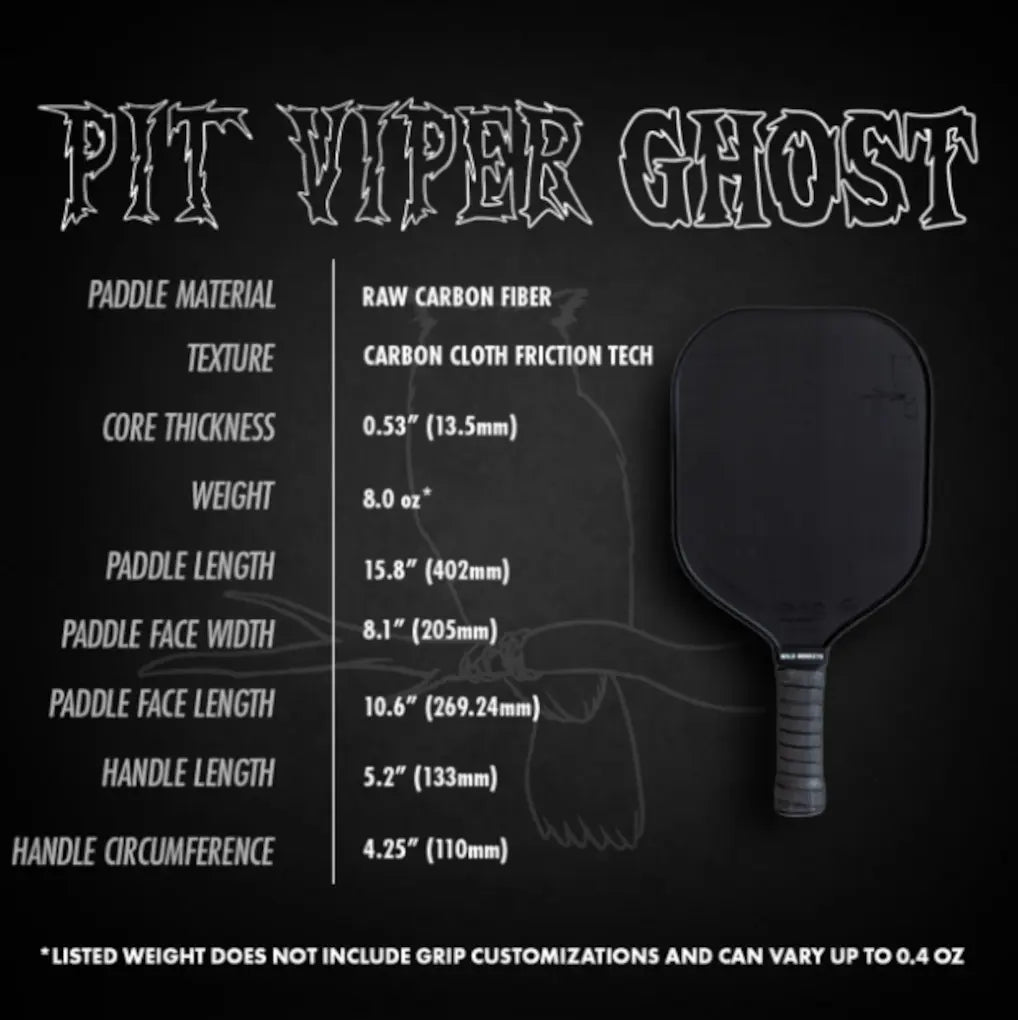 Combine the best features of Pit Viper 3K (wide body, 7.5 oz, 13.5mm core) with the spin potential of a raw T700 carbon fiber face enhanced by âcarbon clothâ friction technology. Pit Viper Ghost is finished with the PROLITE Phantom Grip, which has a more subtle color profile and more cushion and tackiness than its diamond counterpart.