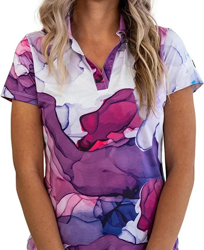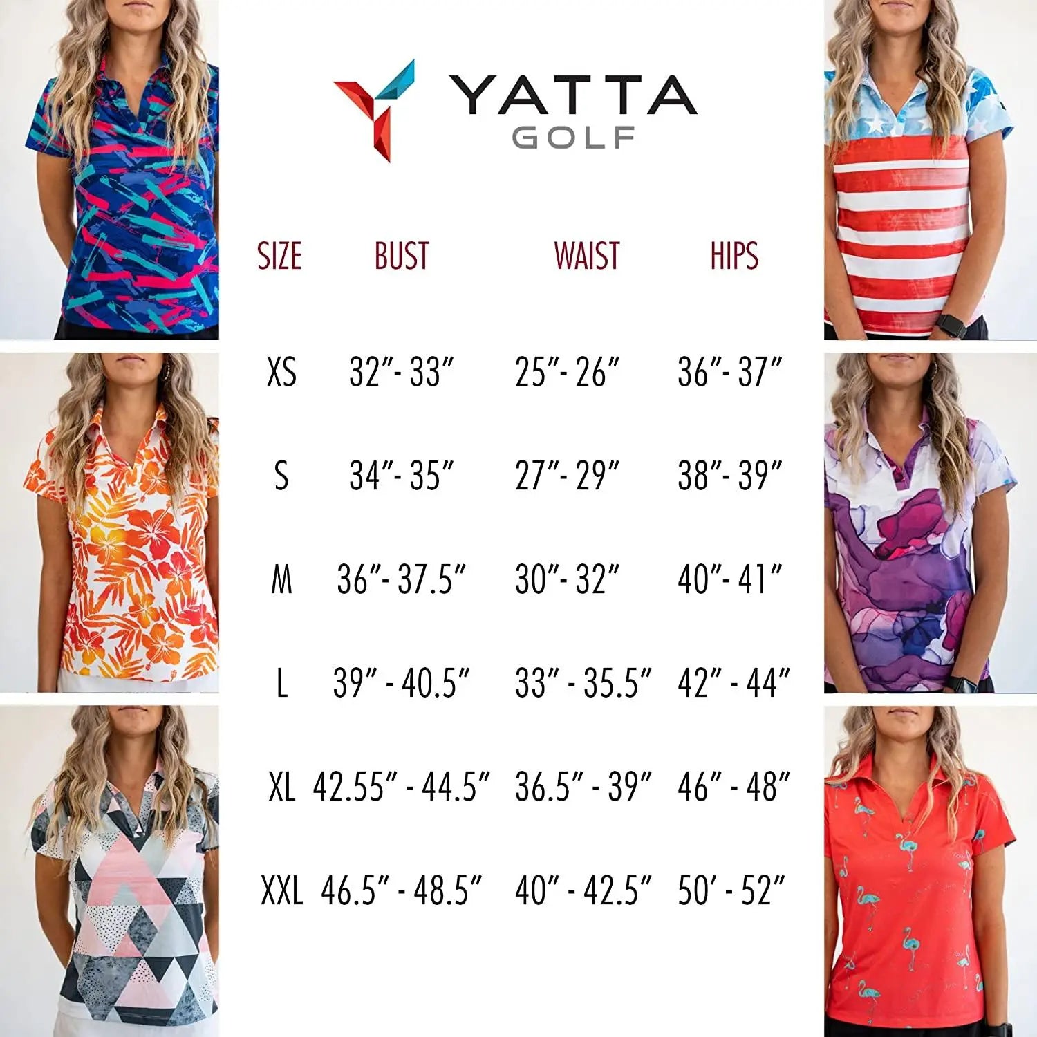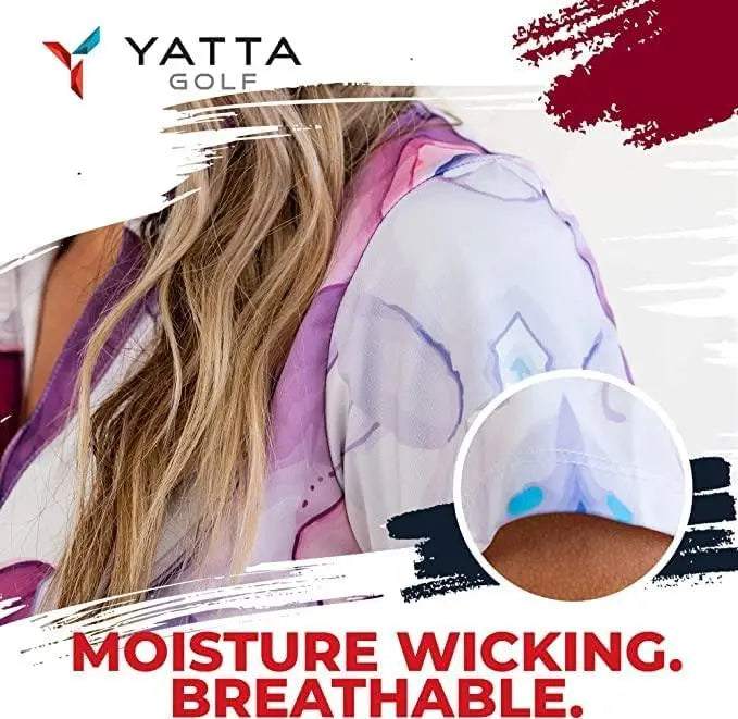 • V-Neck Polo Collars. Standout Designs – Looking great and feeling good on the course is always a plus. Step up your game with the Yatta Golf Women's Golf Polo. This stylish womens golf polo apparel has a comfortable fabric that can keep you dry through even the sweatiest rounds, while maintaining an eye-catching style. Versatile enough to wear every round, this short-sleeved top is perfect as an everyday golf shirt or an athletic womens outfit.