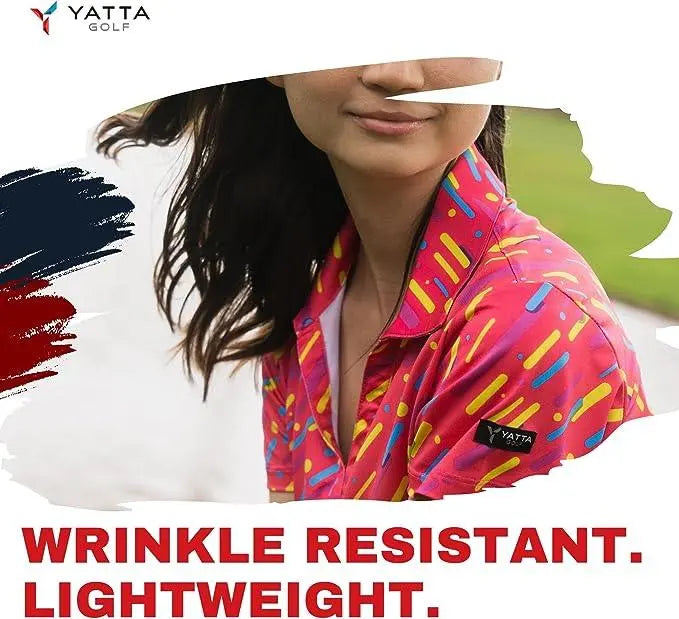 • V-Neck Polo Collars. Standout Designs – Looking great and feeling good on the course is always a plus. Step up your game with the Yatta Golf Women's Golf Polo. This stylish womens golf polo apparel has a comfortable fabric that can keep you dry through even the sweatiest rounds, while maintaining an eye-catching style. Versatile enough to wear every round, this short-sleeved top is perfect as an everyday golf shirt or an athletic womens outfit.