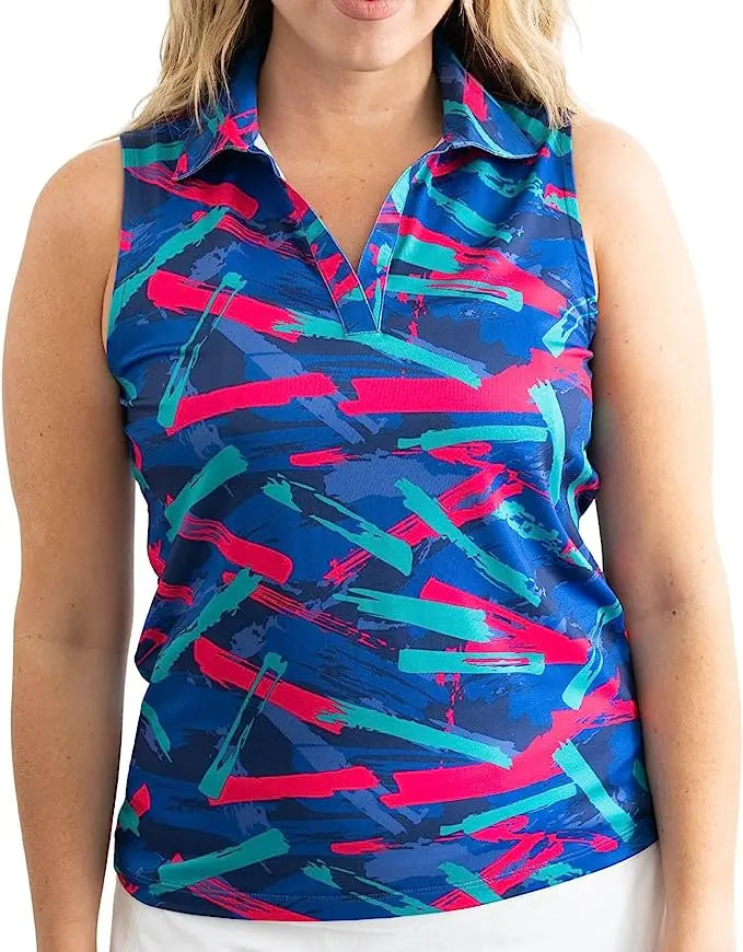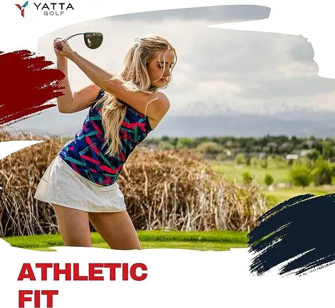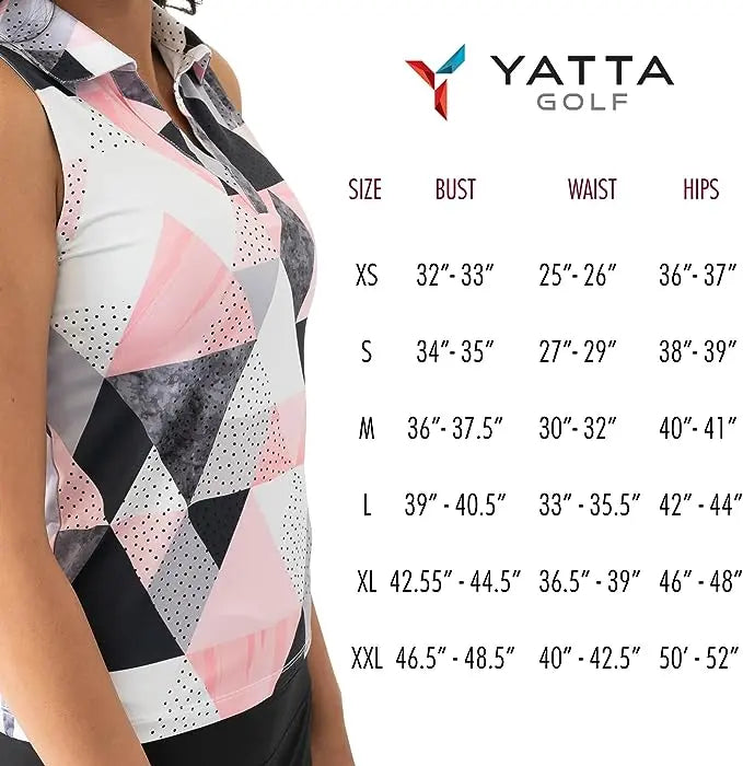 - V-Neck Polo Collars. Standout Designs – Looking great and feeling good on the course is always a plus. Step up your game with the Yatta Golf Women's Golf Polo. This stylish womens golf polo apparel has a comfortable fabric that can keep you dry through even the sweatiest rounds, while maintaining an eye-catching style. Versatile enough to wear every round, this sleeveless top is perfect as an everyday golf shirt or an athletic womens outfit.