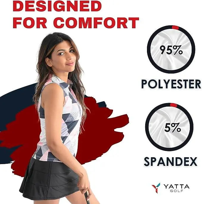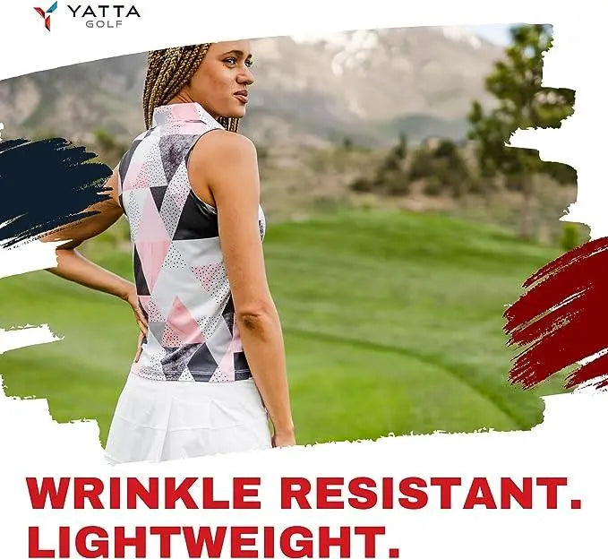 • V-Neck Polo Collars. Standout Designs – Looking great and feeling good on the course is always a plus. Step up your game with the Yatta Golf Women's Golf Polo. This stylish womens golf polo apparel has a comfortable fabric that can keep you dry through even the sweatiest rounds, while maintaining an eye-catching style. Versatile enough to wear every round, this short-sleeved top is perfect as an everyday golf shirt or an athletic womens outfit.
