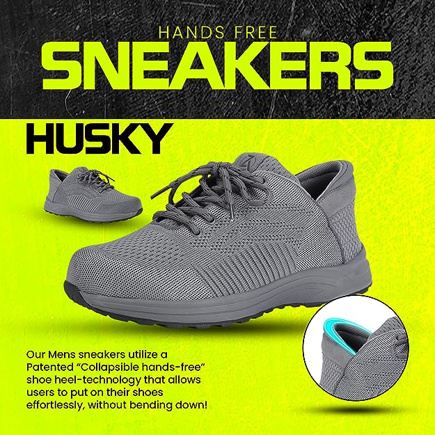 - HANDS FREE: Zeba Sneakers for Men requires no bending and no tying. Our Mens sneakers utilize a Patented Collapsible hands-free shoe heel-technology that allows users to put on their shoes effortlessly, without bending down! The back of ZEBA shoes collapses downward and pops back up once the foot is inside the shoe, so that it doesnt require bending or tying.