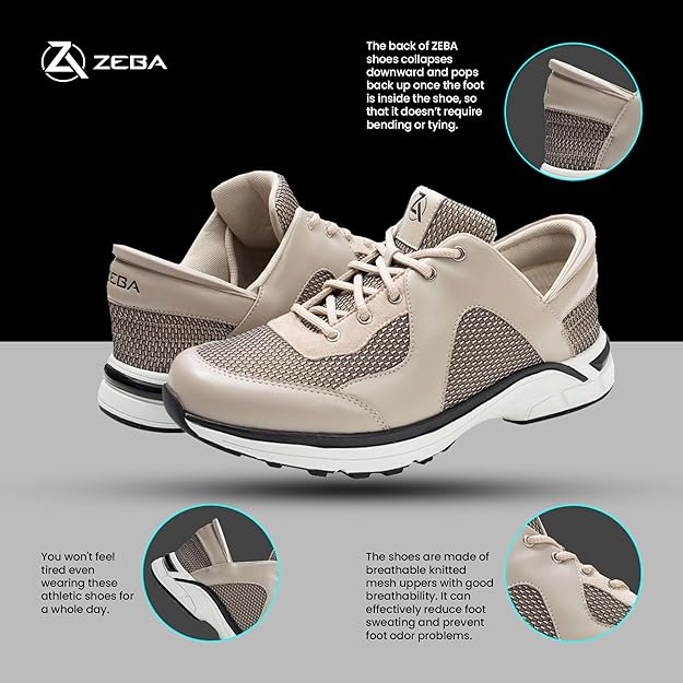 • Put your sneakers on without bending down (Our signature Zeba sneakers use our patent pending "collapsible shoe heel" technology which allows users to put their shoes on effortlessly)